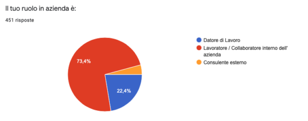 In pochi giorni il sondaggio ha raccolto ben 451 risposte! La maggior parte, con un 73%, sono stati lavoratori, seguiti al 22% dai datori di lavoro ed una minima parte finale da consulenti esterni, ovvero freelance e consulenti aziendali.