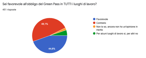 Indubbiamente un dato importantissimo è stato invece investigare quanti si sono espressi a favore del green pass. Le risposte hanno evidenziato molta incertezza; infatti il 48% ha dichiarato di “non essere favorevole al green pass nei luoghi di lavoro”, mentre il 44,6% ritiene essere a favore. Una parte minima di indecisi e un 5% convinti che il GP andrebbe differenziatosi in base al luogo di lavoro.