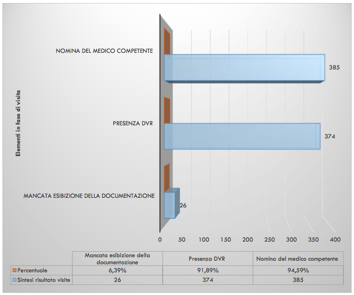Durante le visite attraverso una check list vengono richieste informazione, formazione e presa visione di documentazione. Dai dati emersi, e che di seguito vengono riportati, la quasi totalità delle aziende mettono a disposizione la documentazione relativa alla sicurezza senza difficoltà. E’ quasi sempre presente il titolare durante la fase di visite, in alcuni casi anche il Responsabile del servizio di Prevenzione e Protezione come consulente esterno.