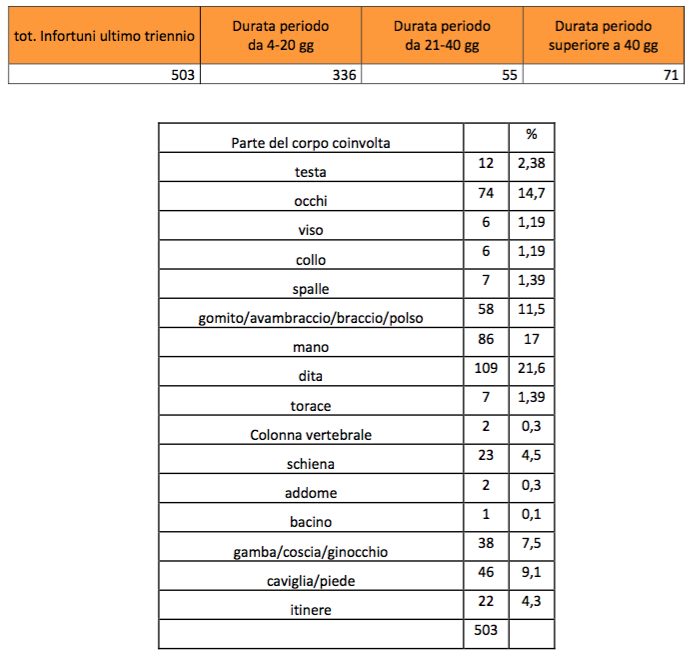 Nel corso delle visite aziendali vengono rilevati i dati relativi agli infortuni avvenuti in azienda nell’ultimo triennio, come risultanti dal registro infortuni. Rispetto alle aziende visitate i dati riscontrati sono stati i seguenti: