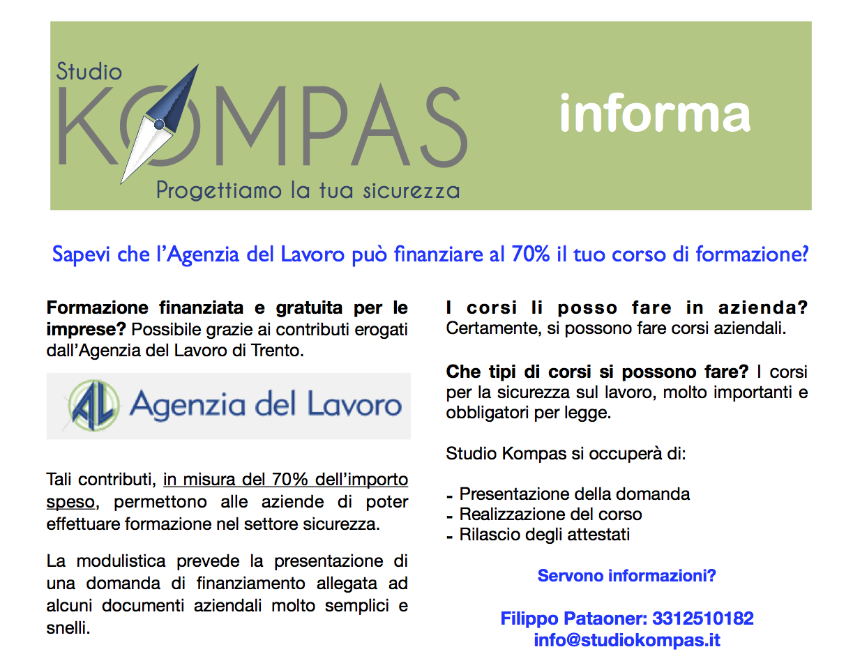 Importanti novità sotto il profilo della formazione finanziata. L’Agenzia del Lavoro di Trento ha infatti destinato nuove risorse ai programmi di formazione in merito alla sicurezza sul lavoro.