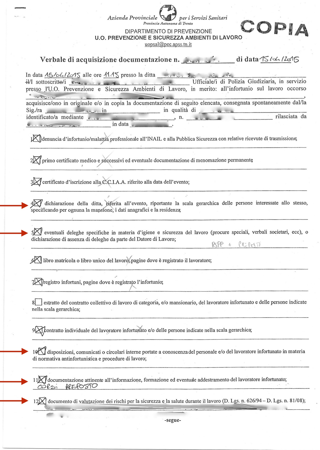 Partendo dal presupposto che tutti i punti elencati nel verbale sono importanti, abbiamo volutamente scelto di indicare con una freccia rossa quelli che appaiono più significativi in merito alla sicurezza sul lavoro ed agli adempimenti normativi che ne conseguono.