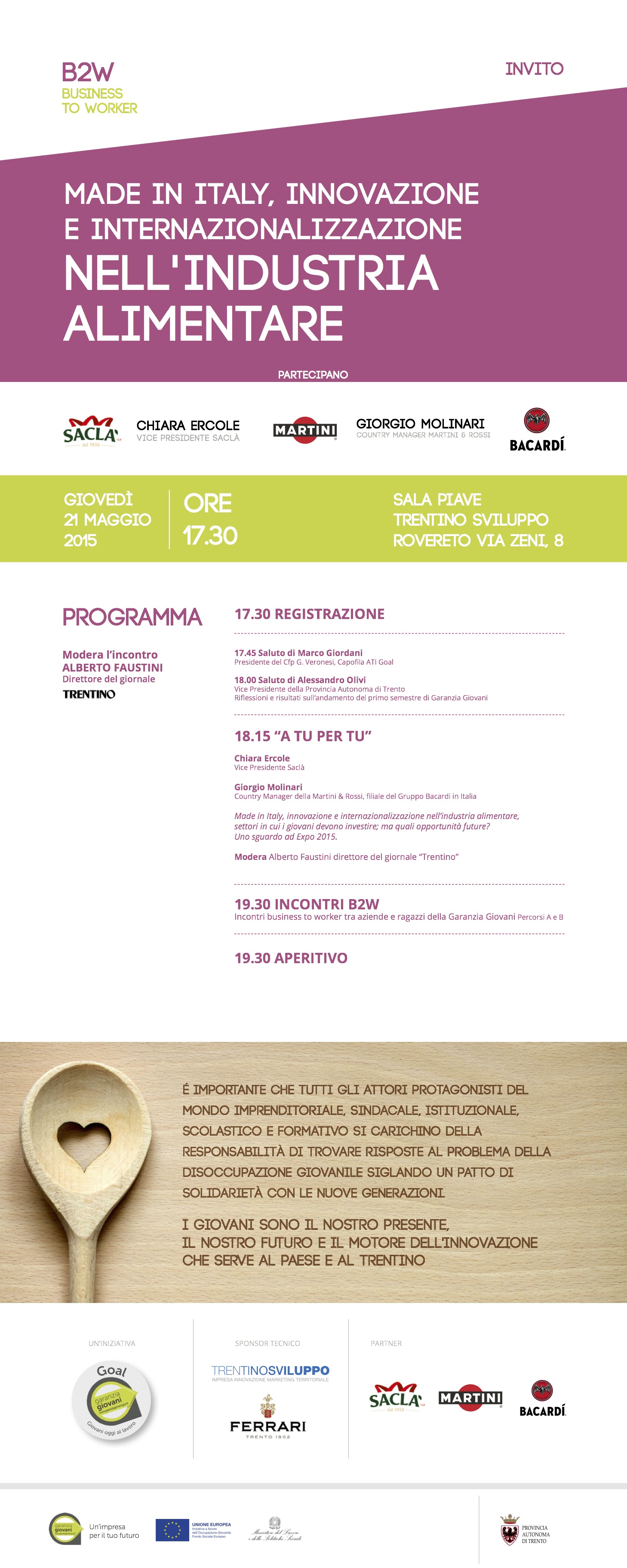 Ritornano gli appuntamenti B2W Business to Worker promossi da Garanzia Giovani e CFPG Veronesi. Il tema del prossimo incontrerò sarà l’attualissimo “Made in Italy, innovazione internazionalizzazione nell’industria alimentare”.