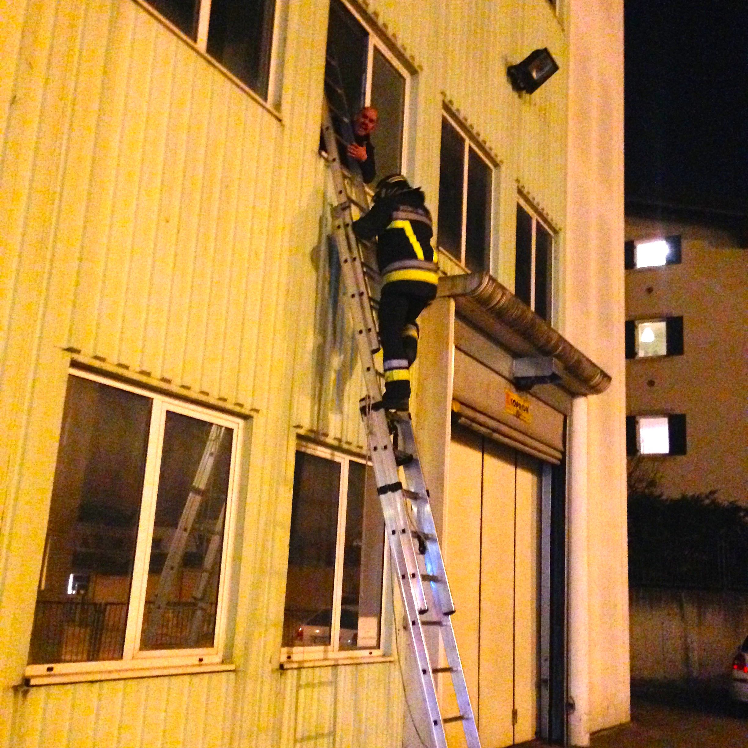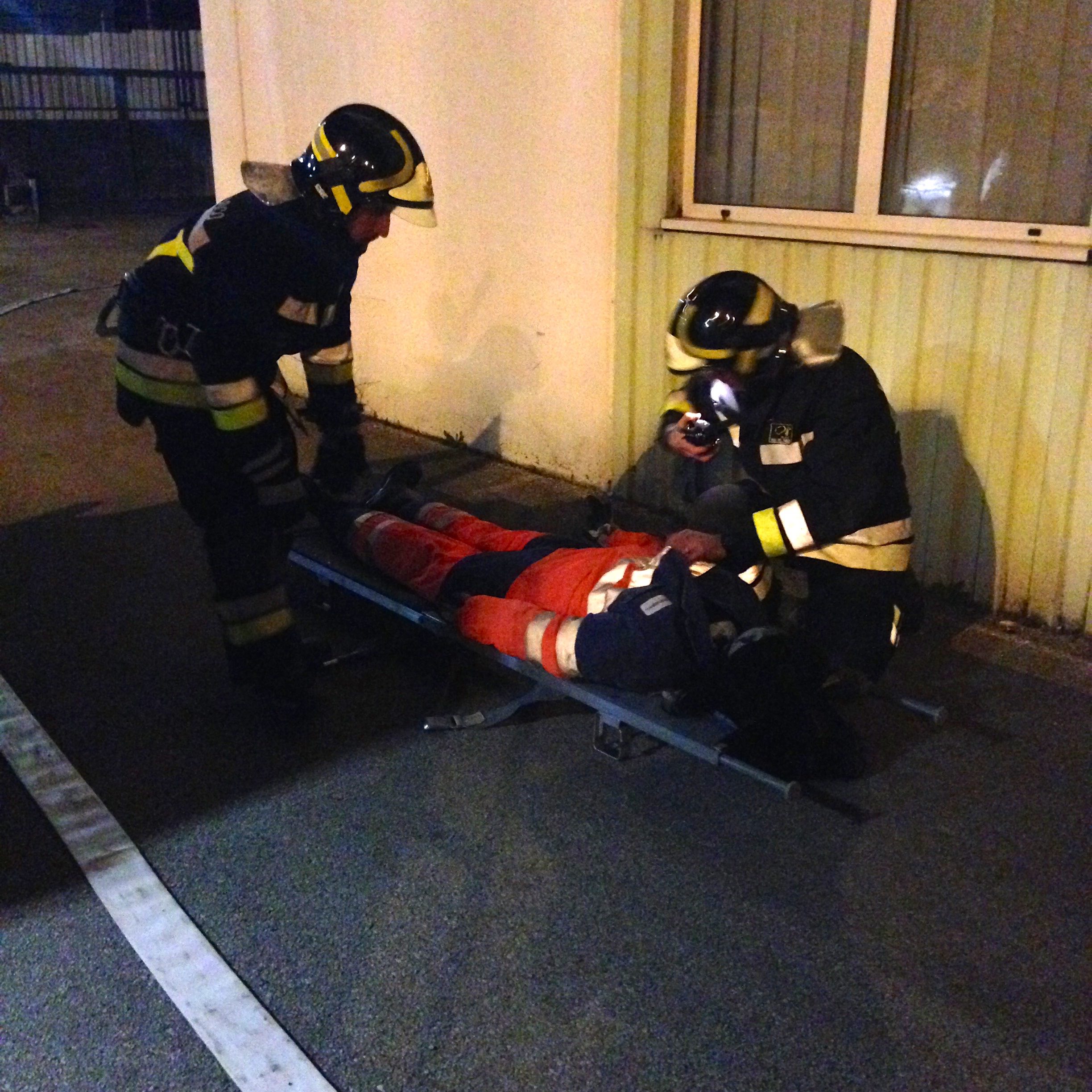 La prova è stata strutturata come un vero e proprio intervento, posizionando due manichini (dal peso di 80 kg l’uno) dislocati nell’azienda, più una persona vera (il preposto ed RLS aziendale) che simulava di essere rimasto intrappolato al primo piano. Tale persone aveva anche il compito di effettuare azioni “di disturbo” ai VVF, simulando quindi una persona spaventata e in forte stato di panico. Compito dei VVF era quindi perlustrare l’azienda (di notte al buio) per salvare i superstiti dislocati sui vari piani.