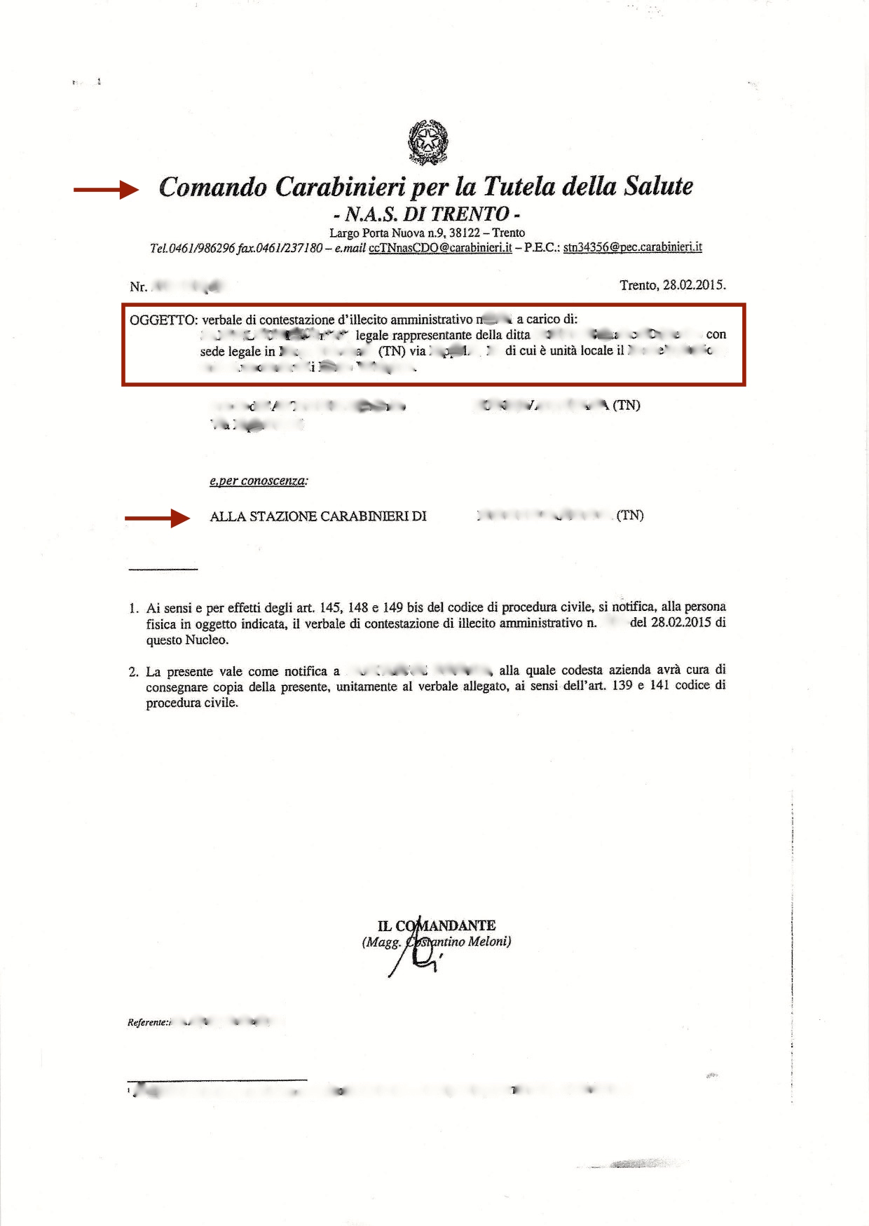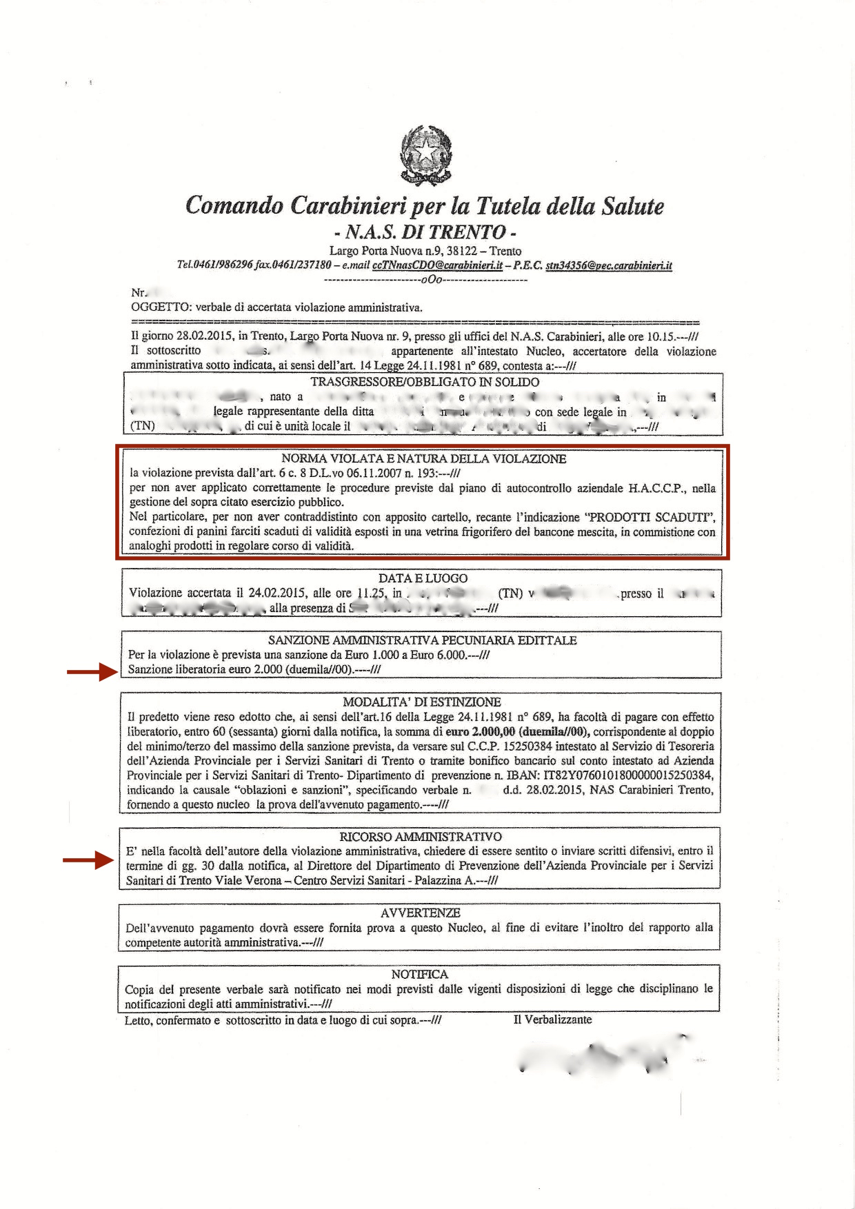 Segnaliamo inoltre che è possibile, entro il termine di 30 giorni dall’avvenuta notifica, chiedere consiglio o produrre scritti difensivi direttamente l’Azienda Sanitaria (e non ai NAS).