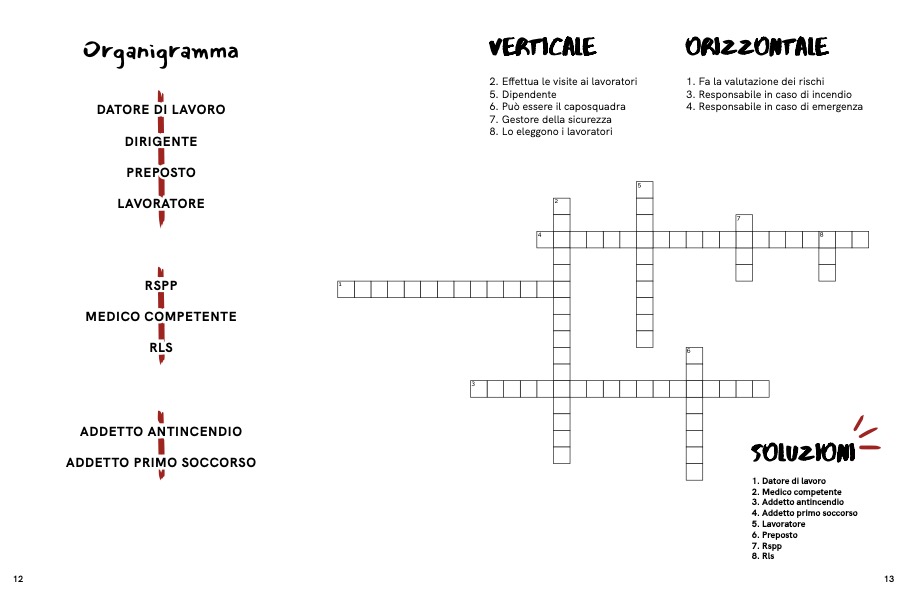 La prima parte del manuale descrive aspetti normativi trasformati in esercitazioni da completare per il lavoratore. In questo modo il soggetto deve esercitarsi per completare quiz ed esercitazioni. Non poteva mancare un estratto del nostro famoso cruciverba della sicurezza (clicca qui) che è stato inserito in forma più semplice:
