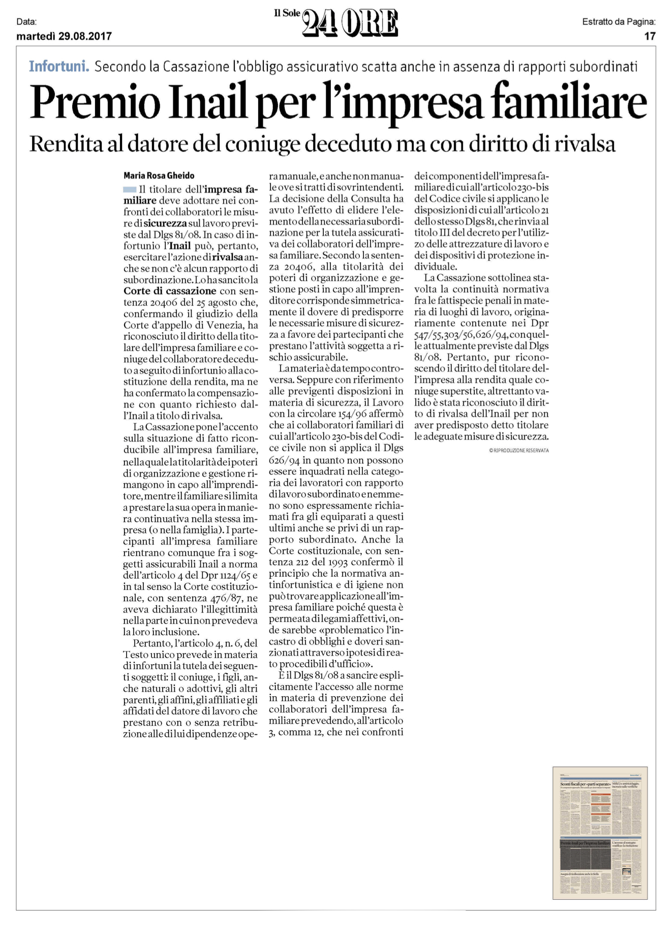 Pubblichiamo per intero il ritaglio della notizia direttamente dal giornale Il sole 24 ore, che merita sicuramente di essere letta con attenzione anche in attesa di leggere le motivazioni complete della sentenza per una migliore analisi dei fatti proposti.