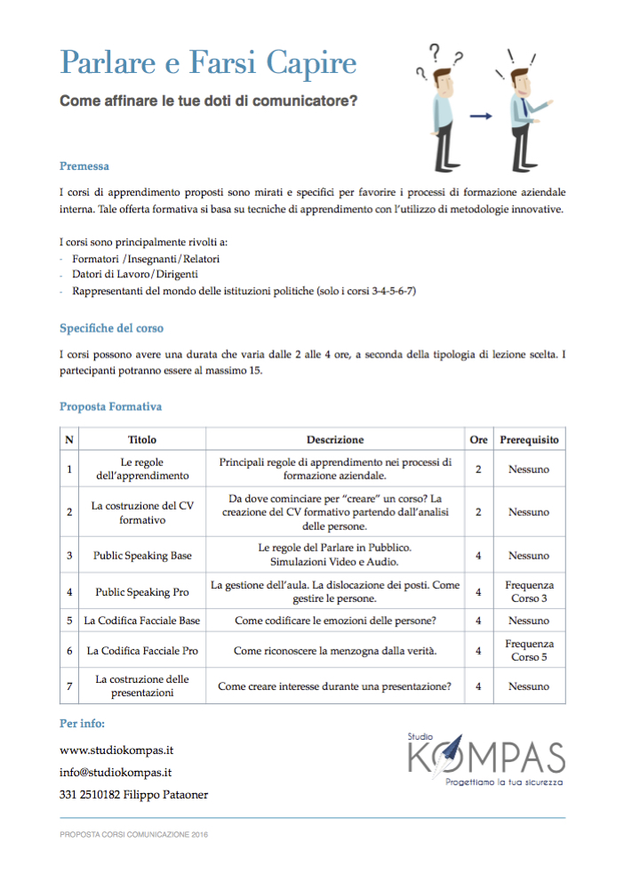 Questa reale necessità ha portato Studio Kompas ad effettuare, nel corso del 2015, una serie di corsi specifici inerenti la comunicazione e parlare in pubblico, principalmente rivolti ad aziende o gruppi di persone specifiche per settore (esempio: formatori, commercianti, individui impegnati nel mondo delle istituzioni).
