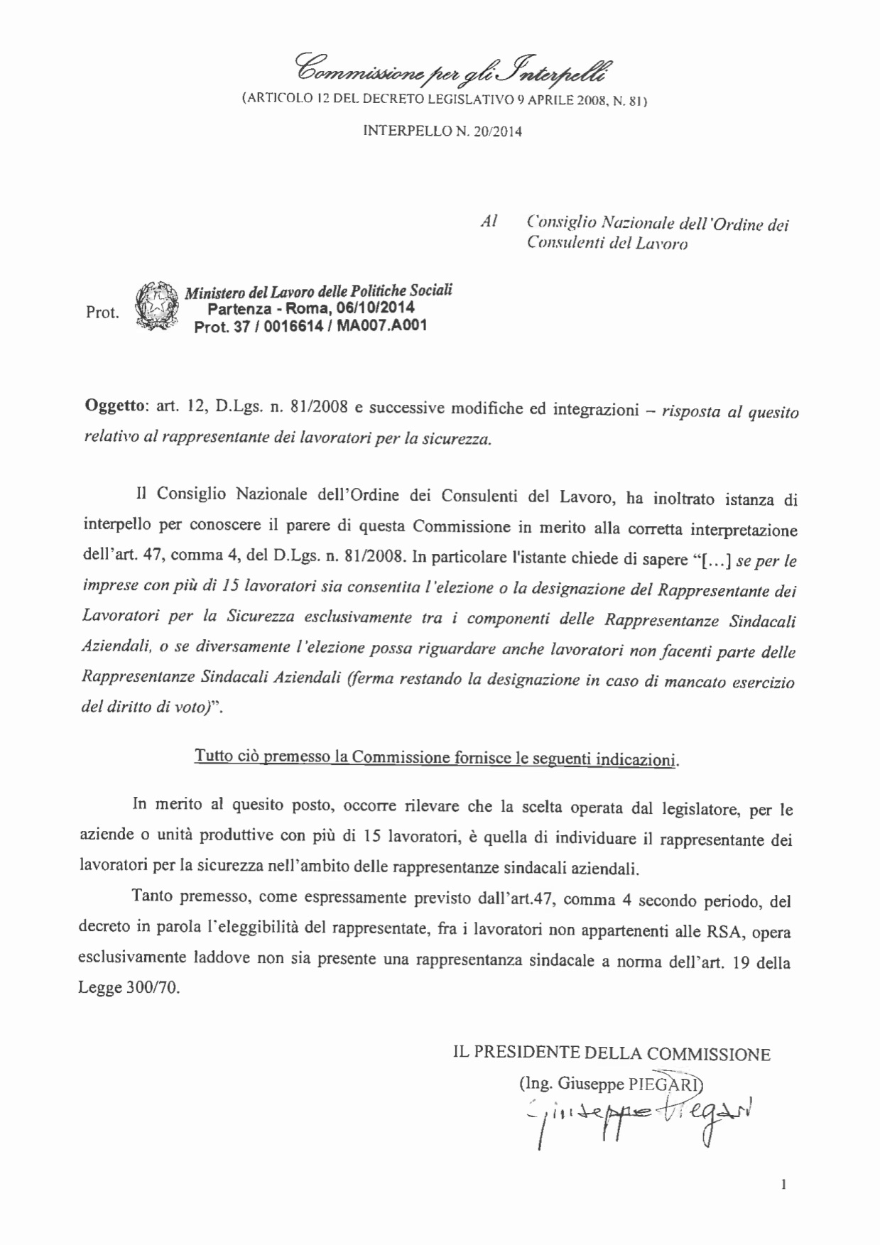 Come promesso nei procedenti post (clicca qui per leggere la notizia) torniamo rapidi sulla questione Rls, analizzando le modalità di elezione del Rappresentate dei Lavoratori per la Sicurezza. Lo facciamo pubblicando l’interpello n.20/2014, il quale pone una domanda molto chiara, ovvero se nelle aziende con più di 15 lavoratori sia consentita l’elezione o la designazione del Rls esclusivamente tra i componenti delle rappresentate sindacali aziendali.