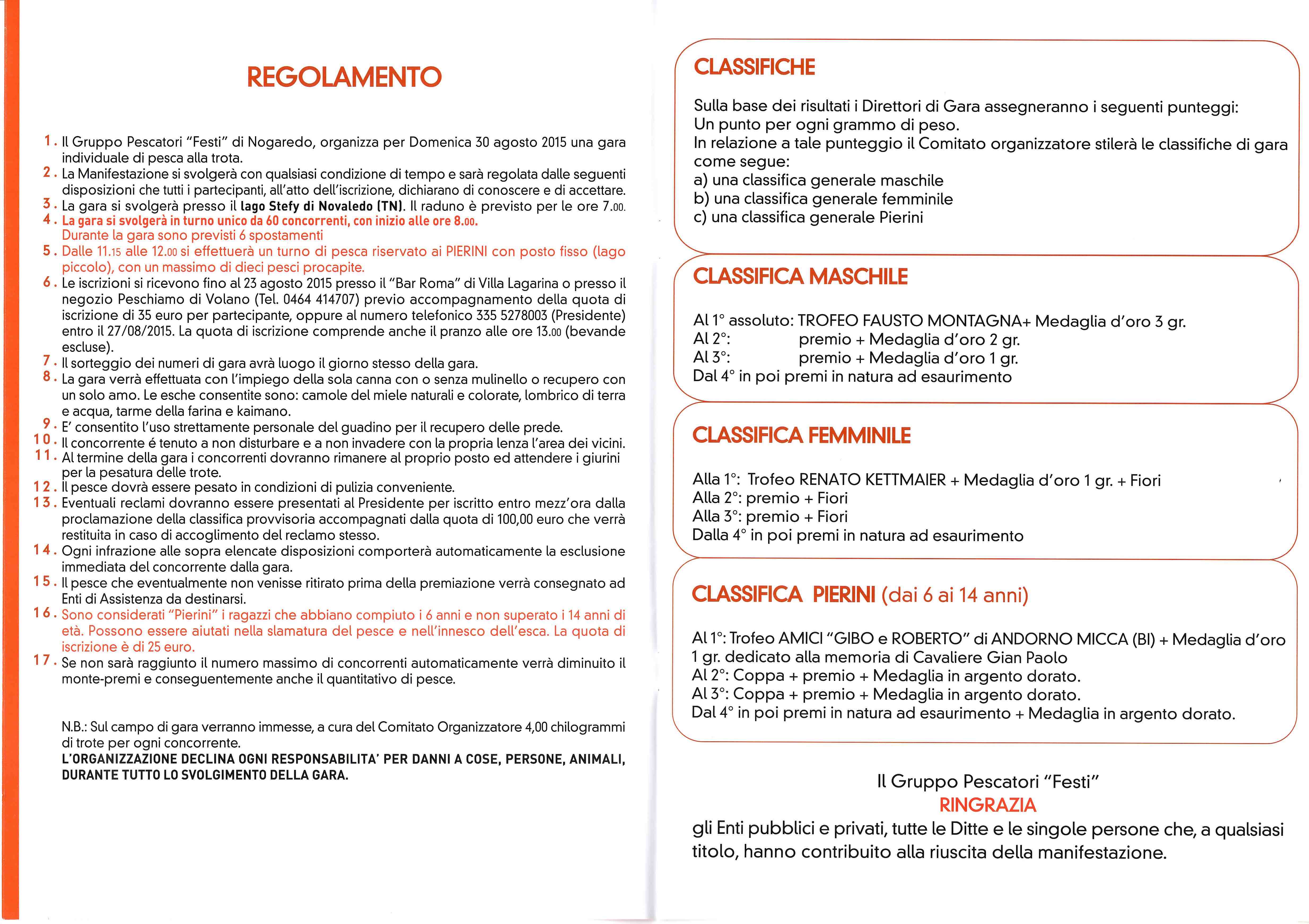 La gara individuale di pesca alla trota, appuntamento ormai classico per gli appassionati, vedrà sfidarsi numerosi pescatori nelle seguenti classifiche: Maschile, Femminile e Pierini.