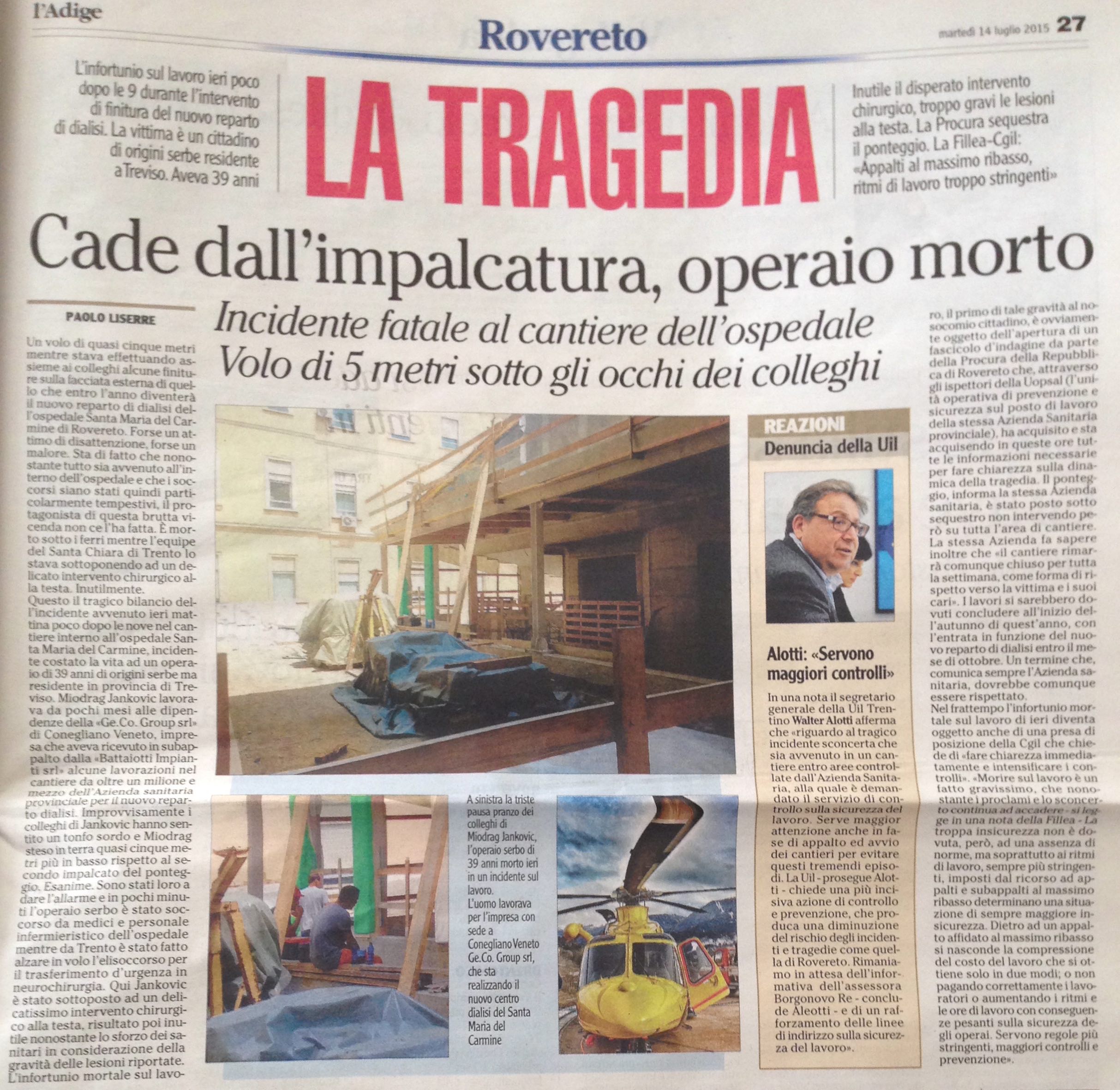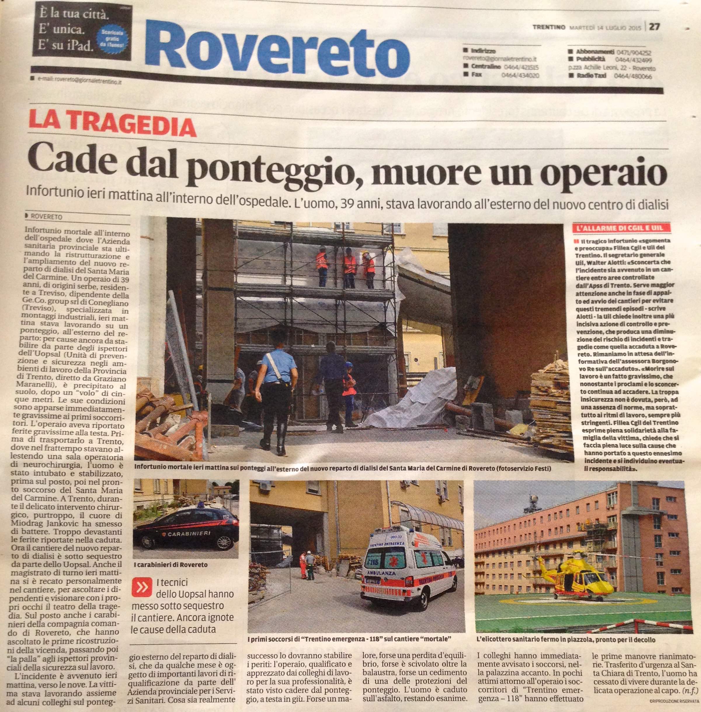 Un infortunio mortale, da caduta dall’alto, è avvenuto nei giorni scorsi nel cantiere dell’Ospedale di Rovereto. Un lavoratore, per cause ancora da accertare, è piombato al suolo dopo un volo di 5 metri. Nonostante i soccorsi non c’è stato nulla da fare. Ancora una morte, ancora una tragica morte da caduta dall’alto.