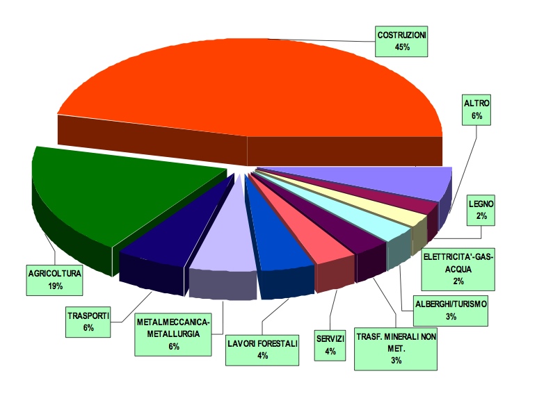 Il grafico mostra chiaramente che gli infortuni con esito mortale si sono verificati maggiormente nel settore delle costruzioni (in linea peraltro con il dato Nazionale), il quale rappresenta la fetta più ampia di casi. Alla luce di questi risultati ho ritenuto opportuno affinare la ricerca per capire quale tipologia di incidenti si verifica maggiormente all’interno del mondo delle costruzioni: