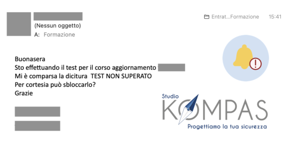 Un cliente, durante lo svolgimento di un corso e-learning, non ha superato il test di fine modulo. La piattaforma in questo caso si blocca e richiede obbligatoriamente un ripasso di determinati argomenti, per poi passare (solo in caso di esito positivo) al modulo successivo. Da qui l’email di richiesta di “sblocco” della piattaforma per permettere di continuare. Sblocco che, per dovere di cronaca, non è ovviamente avvenuto. Abbiamo infatti consigliato al corsista di riposare gli argomenti e di riprovare il test prestando più attenzione.